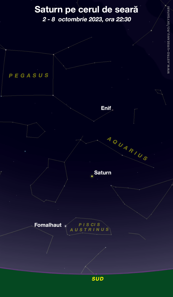 Se poate găsi foarte ușor dacă priviți înspre sud pe la ora 22:30. Deasupra orizontului se vede steaua Fomalhaut, iar mai sus de aceasta chiar Saturn.
